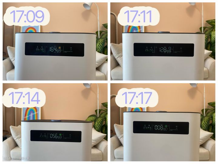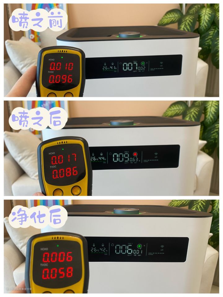 喷之前室内的甲醛数值为0.010,喷之后为0.017,净化5分钟之后的数值为0.006,比喷之前的空气质量还要好。 虽然机器本身也是显示甲醛数值的,但是大家也看到了,差别还是挺大的,所以大家在使用的时候不用太过焦虑,室内一直开启空气净化器的情况下,差别会大大减小的。