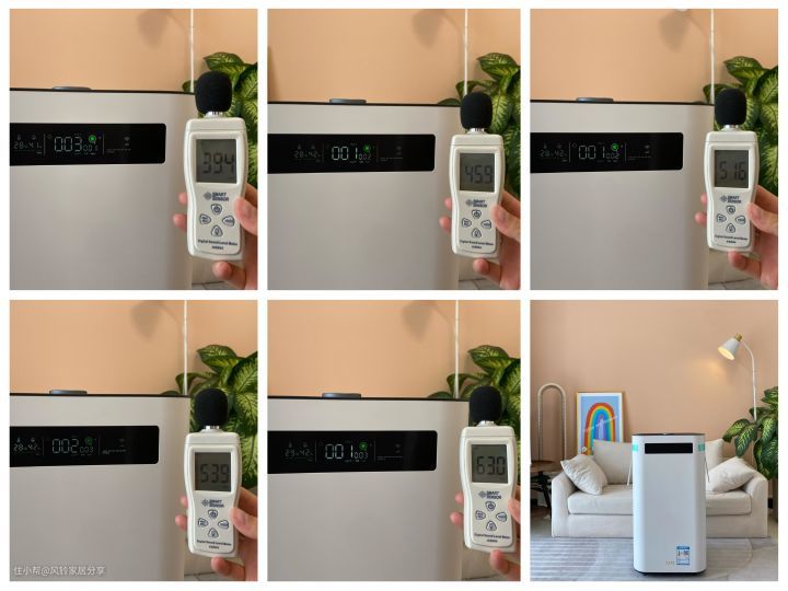 一档噪音为39.4db;二档噪音为45.9db;三档噪音为51.6db;四档噪音为53.9db;五档噪音为63db。 一档的噪音可以说几乎是没有的,二三四档的噪音适中,五档的噪音类似于风扇高档位运行的噪音,不过五档运行时很快就可以将室内的空气净化完成,之后就可以调到中档位了,所以问题也不大。再风速测试中,四档风速和五档风速几乎差了一倍,但是噪音确实递增的没有突然变得很吵。