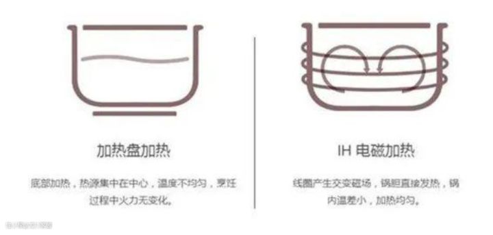 而IH是在锅内空间产生磁场,在磁场作用下,整个锅胆一起发热,整体内胆都是热源。