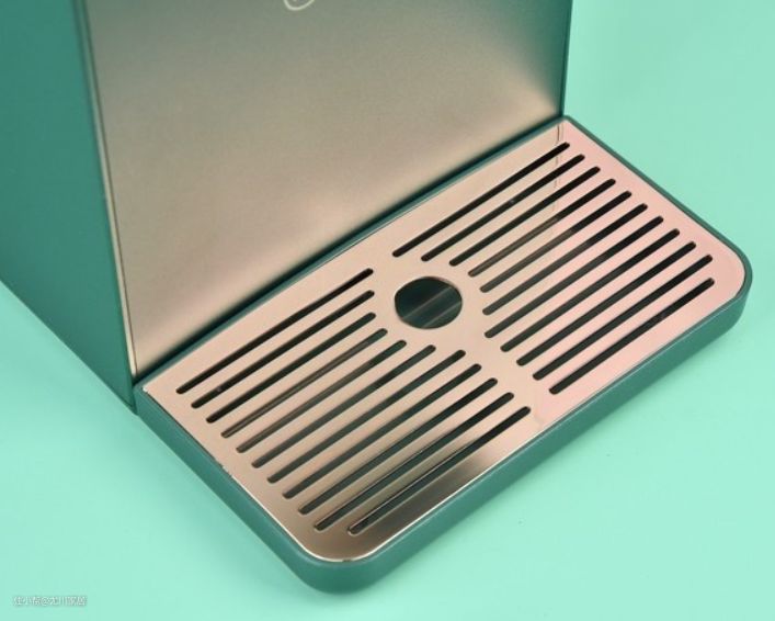 它的滤水盘是磁吸式的,滤网是电镀不锈钢制成,亚光金色和整体配色相协调,质感高级。