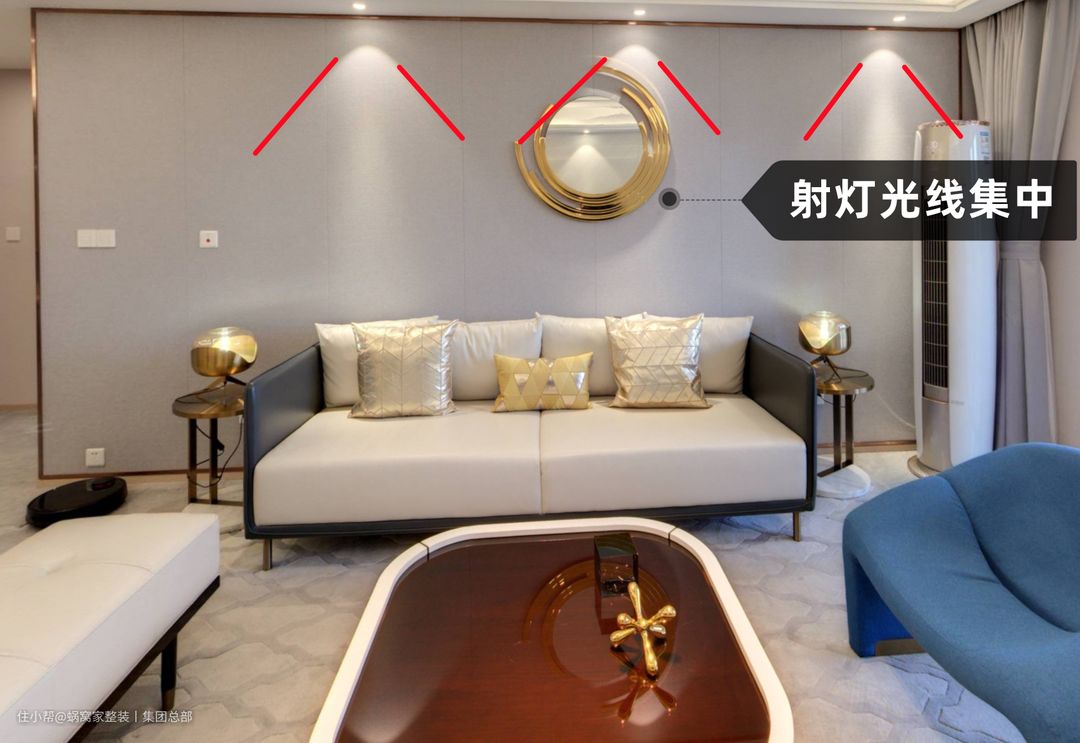 ⑦射灯对墙体的平整度要求会比较高,射灯一打,不平整的墙会特别明显,所以想要用射灯,在油工找平阶段就要多上心了!