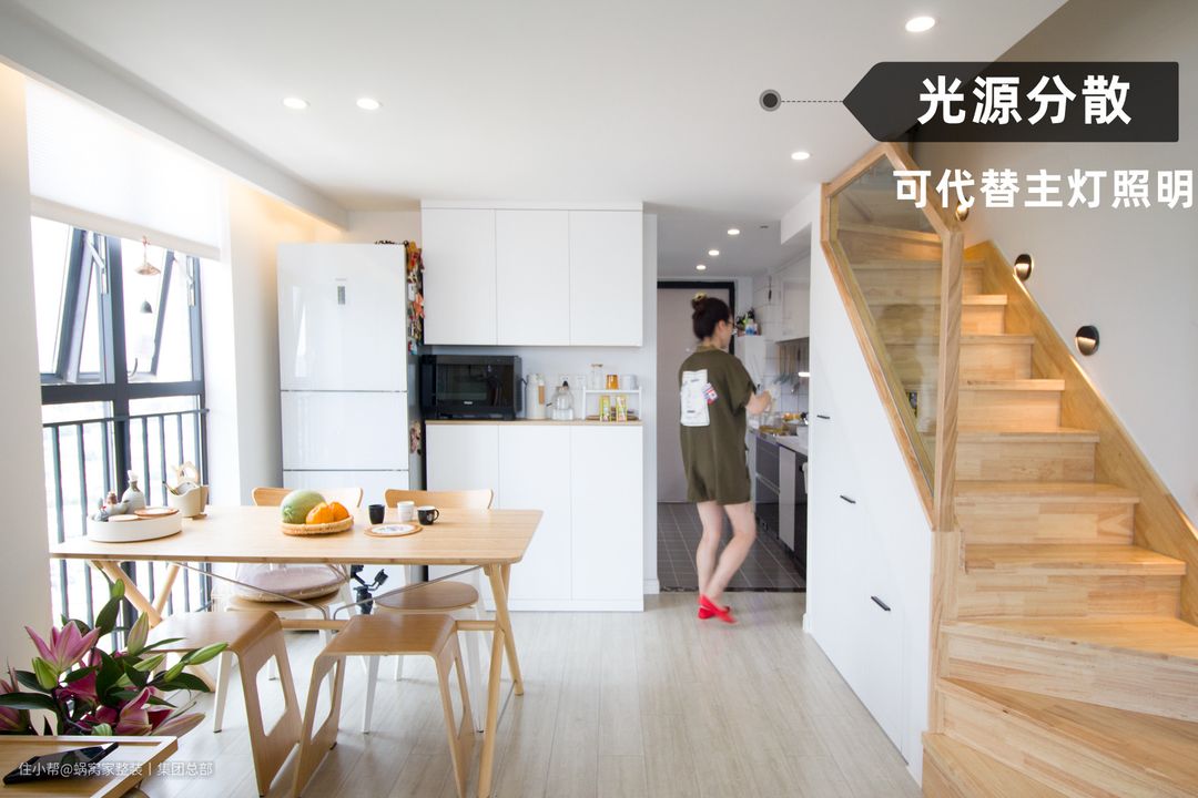 筒灯灯光的光源比较分散均匀,一般用在过道、无主灯大范围应用上,通过均匀的照明让整个空间显得明亮宽敞,可以代替主灯成为空间照明的辅助光源。