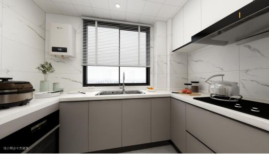 L型的厨房设计,从切菜到洗菜,再到炒菜,也不会显得过于拥挤,而且什么蒸烤箱、洗碗机、热水器都被安排在合适的位置,几乎没有一处空间是用来浪费的。