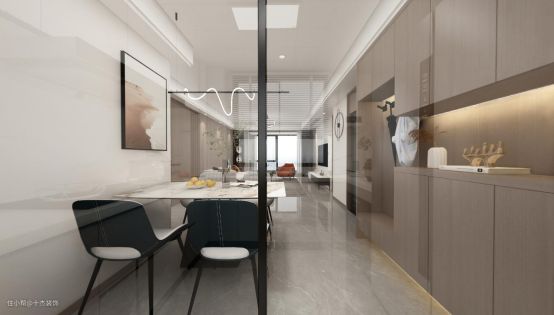 像流水一样的造型吊灯,时尚大气,莫兰迪色的单幅挂画,意境唯美,在这里充满了爱意,一桌四椅,一日三餐,却也能妥善解决生活中的劳累与饥饿。