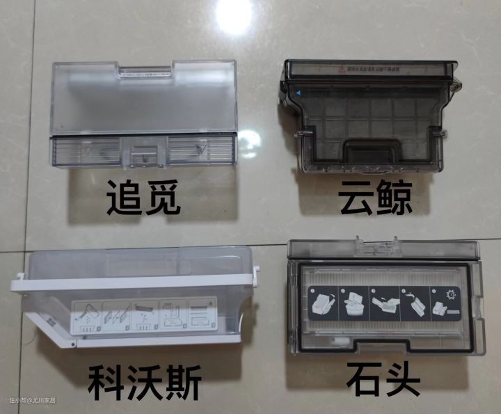 追觅尘盒容量0.45L、云鲸尘盒容量0.43L、科沃斯尘盒容量0.4L、石头尘盒容量0.47L。 容量最大的石头,追觅第二,云鲸和科沃斯次之。 四款尘盒都使用了HEPA滤网,可以单独拆卸进行水洗,晾干后继续使用。 这四款的尘盒没有太大的差距,都足够使用。