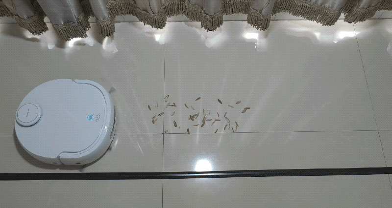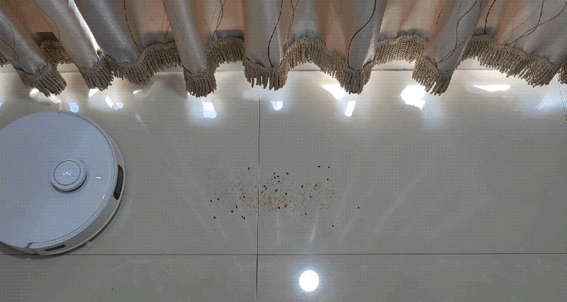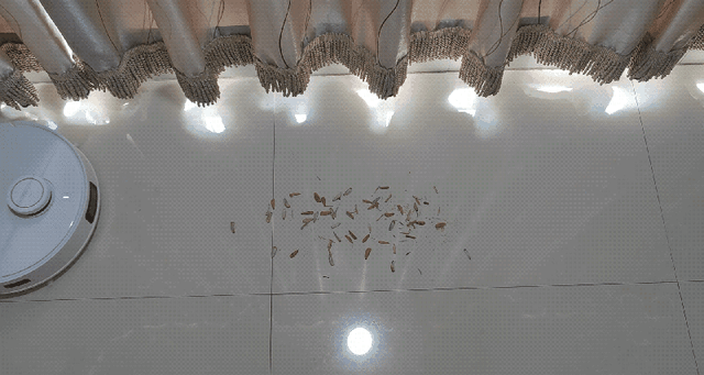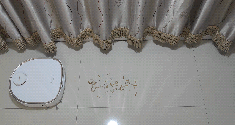 追觅的表现和上面瓜子皮差不多,清扫过程非常解压,一遍过去,没有一丝打飞和漏扫; 云鲸打飞了两三颗小绿豆,但是大部分小颗粒还是清理干净了; 科沃斯的表现就不太理想了,边刷还是会把小颗粒垃圾扫的到处都是; 石头的表现也很不错,没有一丝残留,一遍干净。 看来在扫地这方面,追觅和石头还是比较有优势的。