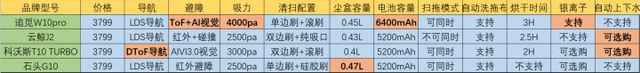 最后总结为表格形式,方便大家分析数据并选购适合自己的一款。 追觅W10pro:自带银离子模块,无需额外付费选购,还是比较良心的。电池容量也是四款中最大的,续航时间最长。尘盒容量做的也很充足。虽然是五幅单边刷,但是聚拢效果一点也不比双边刷差,搭配4000PA大吸力,扫进去的垃圾完全不会漏出。LDS导航、ToF+AI视觉的双重避障配置,可以说是行业内的翘楚了。唯一遗憾的是不支持自动上下水装置,应该后续会推出吧。