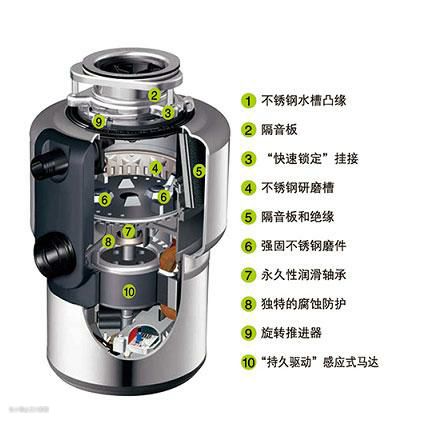 粉碎腔具有过滤作用,自动拦截食物固体颗粒;刀盘设有360度回转的冲击头,没有利刃,安全、耐用、免维护。刀盘转速(满负载,工作状态)直流电机约2000-4000转/分钟。可方便地将菜头菜尾、剩菜剩饭等食物性厨房垃圾粉碎后排入下水道。粉碎后的颗粒直径小于4毫米,不会堵塞排水管和下水道。可轻松实现即时、方便、快捷的厨房清洁,避免食物垃圾因储存而滋生病菌、蚊虫和异味等,从而营造健康、清洁、美观的厨房环境。