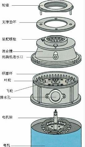 通过小型直流或交流电机驱动研磨盘高速旋转,利用离心力将研磨腔内的食物垃圾转到研磨盘边缘,食物垃圾在研磨锤与研磨环之间快速研磨粉碎后随水流排入下水道。