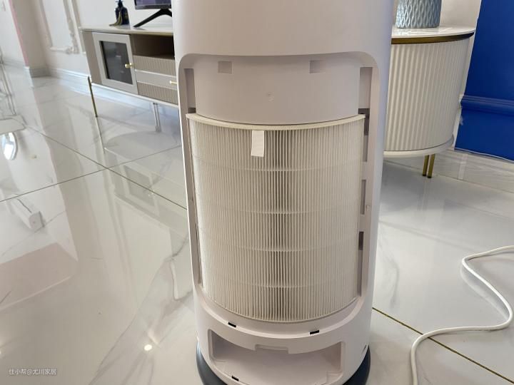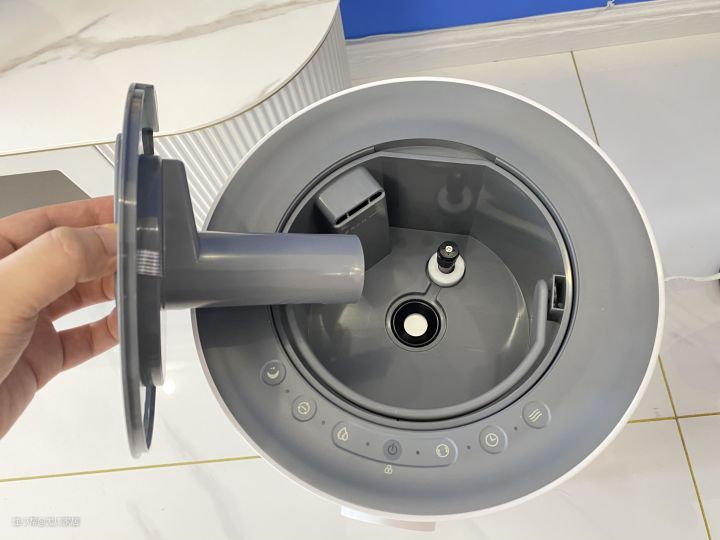 另外顶部除了可以控制机器外还是一个聚能环雾化加湿器,采用分离上提式水箱,可以提出来接水也可以打开中间的圆盖直接往里加水。水箱容量是1.5L,雾化量为99.7ml/h,可以持续工作12小时,一整晚都能补充水分。