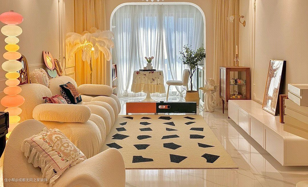奶fufu柔软细腻弧形沙发和羊羔毛材质绝配黑色中古落地灯穿插给空间注入层次感,与原木色家具打造柔和温暖又极具质感的客厅阳光穿过纱帘浅浅照进来的感觉太治愈了~