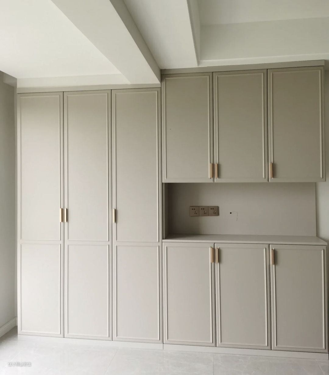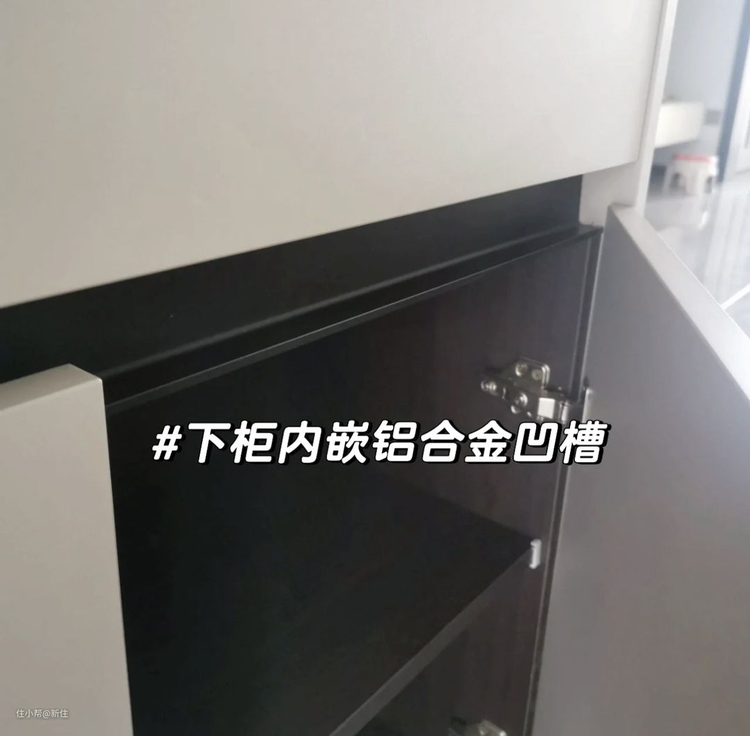 (这些方案,听不懂,没有关系,我们下文会详细讲到,现在你只需要知道,免拉手设计,论简洁反弹器>铣槽>斜切>上下挂方案,下图便是铣槽柜门)