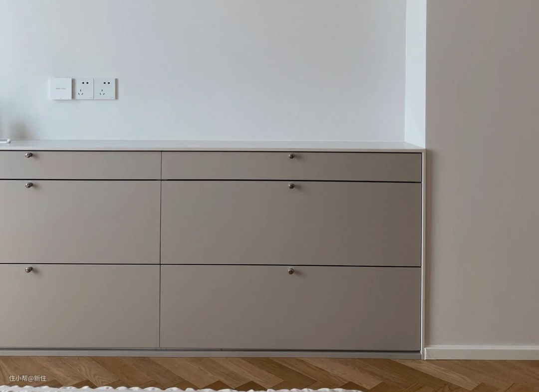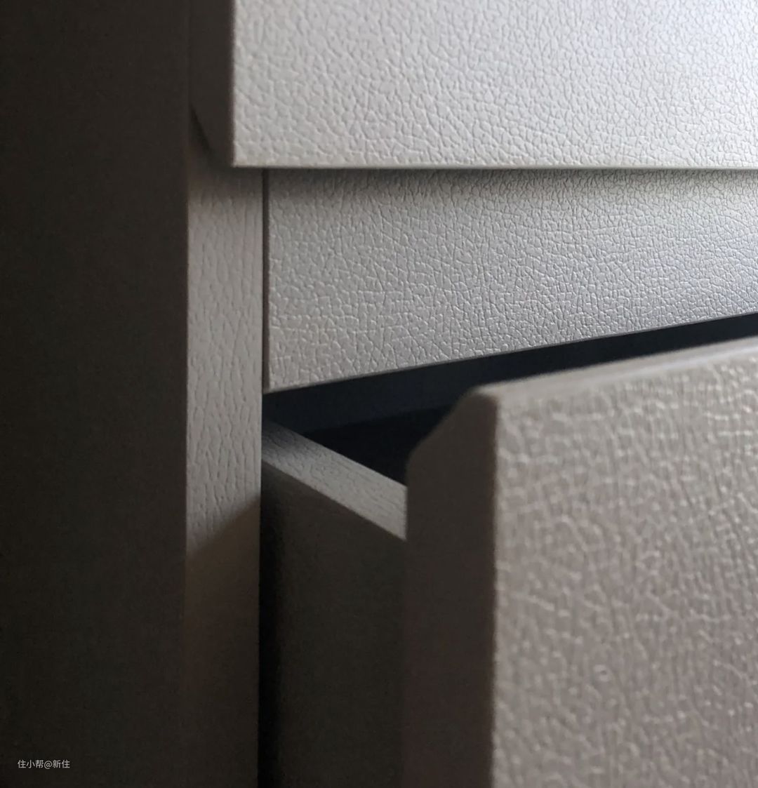 在跟定制设计的沟通上,整个柜子落地跟进上,比较吃力,所以就索性放弃了免拉手设计,直接选择更好理解的拉手!