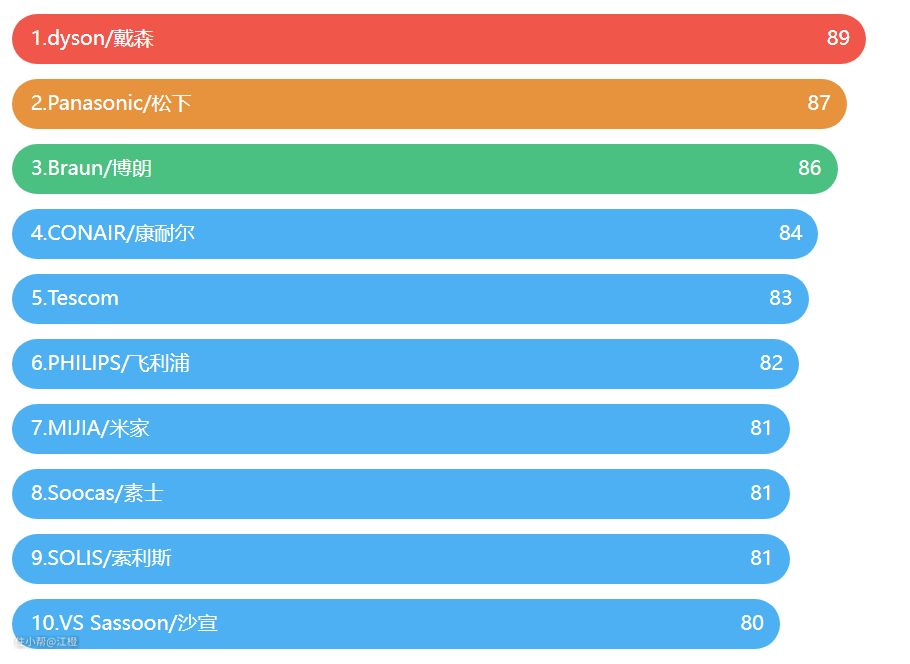 市面上的吹风机品牌五花八门,上图是某网站上吹风机品牌的排行榜前十的,这里边的吹风机都是蛮不错的。接下来我挑几个比较常见的给大家详细讲解一下。