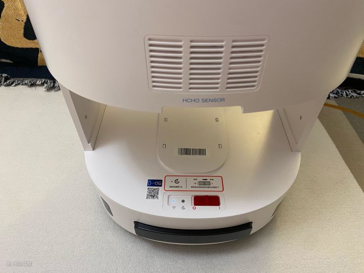 显示界面非常的简洁,都是主要的几种数值:VOC(挥发性有机化合物)情况、PM2.5(细颗粒物)、甲醛。按键也只有四个:三个档位的调节键和自动档、待机键、模式切换键(原地、联动、全屋、区域)。 顶部外围一周的是出风口,上面设有格栅保护,防止宝宝小手伸进去或者异物卡住。
