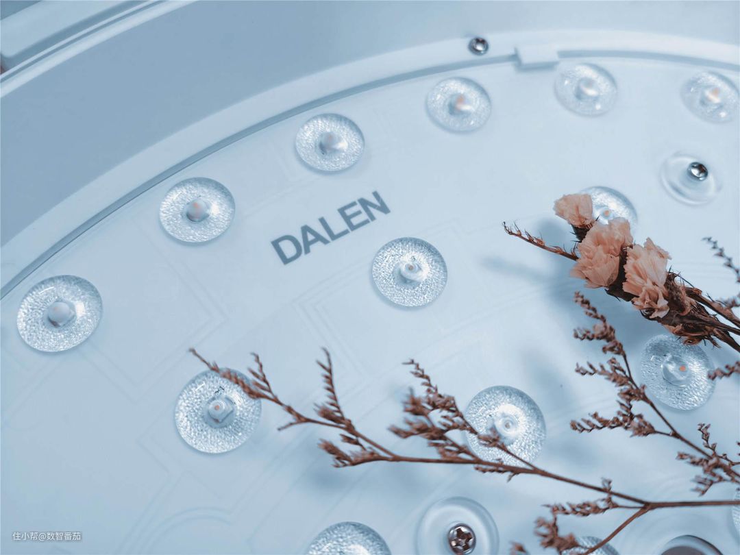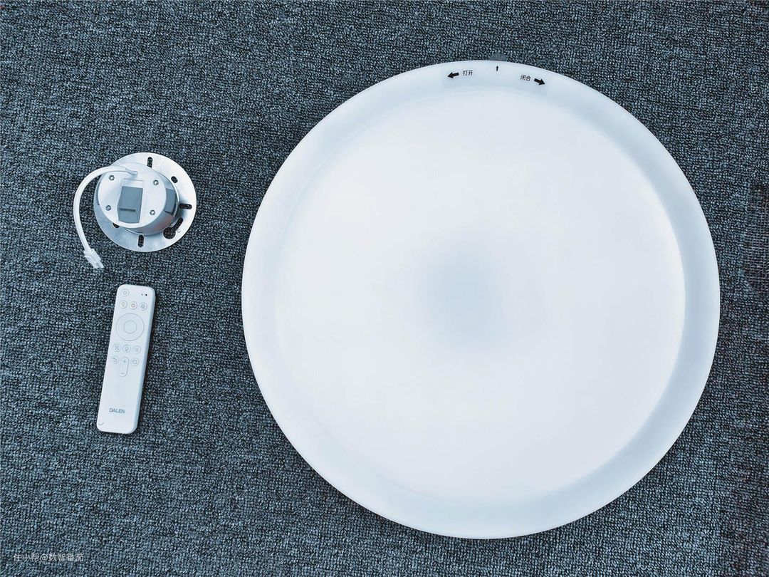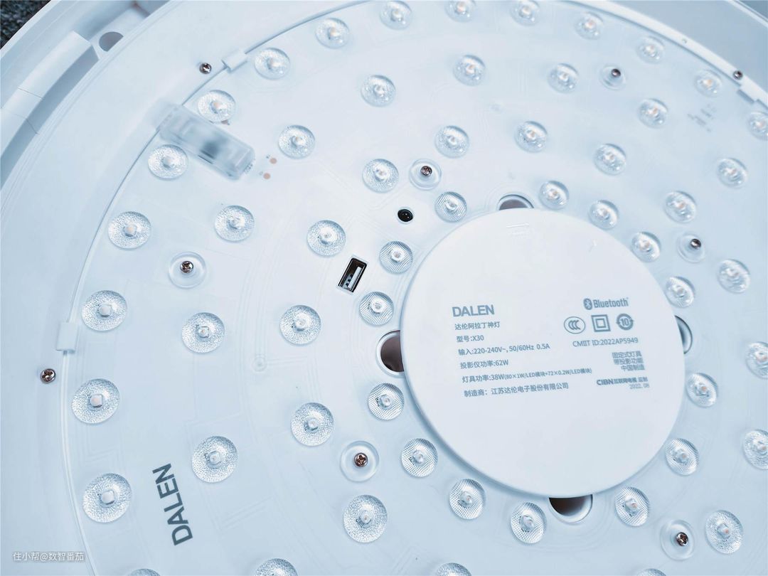 相较普通LED吸顶灯来说,达伦阿拉丁神灯的厚度标示着它的特殊性,内置投影仪等电子零部件,其厚度差不多有10cm,而厚度并不影响它的美感,相反的我个人反而觉得更为美观,洁白的PC+ABS材质所打造的机身,圆润细腻,不像传统投影仪有着浓重的机械感,给人一种很舒适的入眼美,巧妙的蜂窝散热/音响传声分布孔以及恰到好处的黑色投射镜头部件点缀,彰显着设计师的能力很出色。