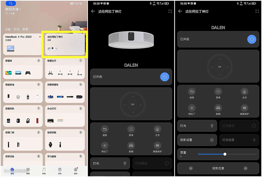 达伦阿拉丁神灯除了本身的无线遥控可全面性操控投影功能及灯光之外,其还有一个亮点就是合入了HUAWEI(华为)的HarmonyOS(鸿蒙智联)生态技术,通过下载安装「华为智慧生活」客户端,可以获得更加直观的操控方式和设置个性化场景。