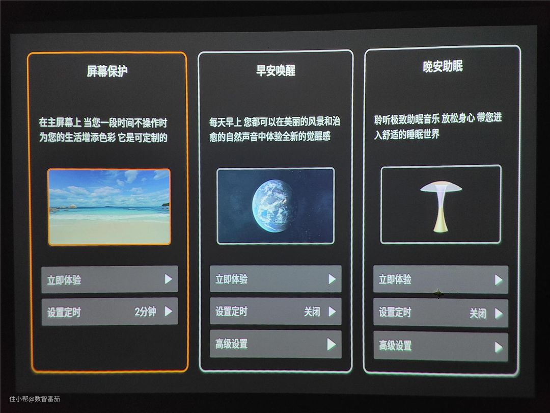 阿拉丁模式:未来墙屏保、早晨唤醒/睡眠模式智能势行指定操作,如定时播放音乐、开关灯,以及助眠音乐模式,感觉特别友好,对于时下工作繁忙的人群来说,起到的作用真的很好。