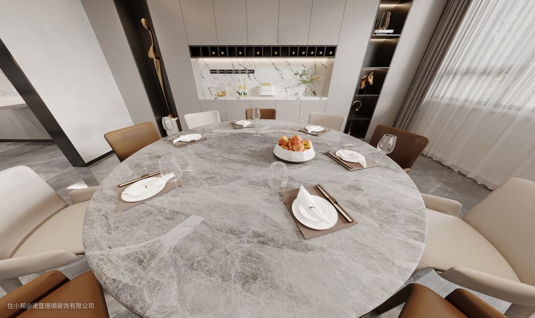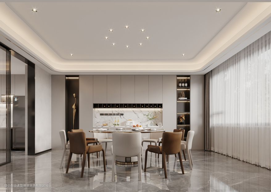 靠墙一面做定制通顶餐边柜,分为展示区与收纳区,有藏有露的设计,更符合功能的实用性。