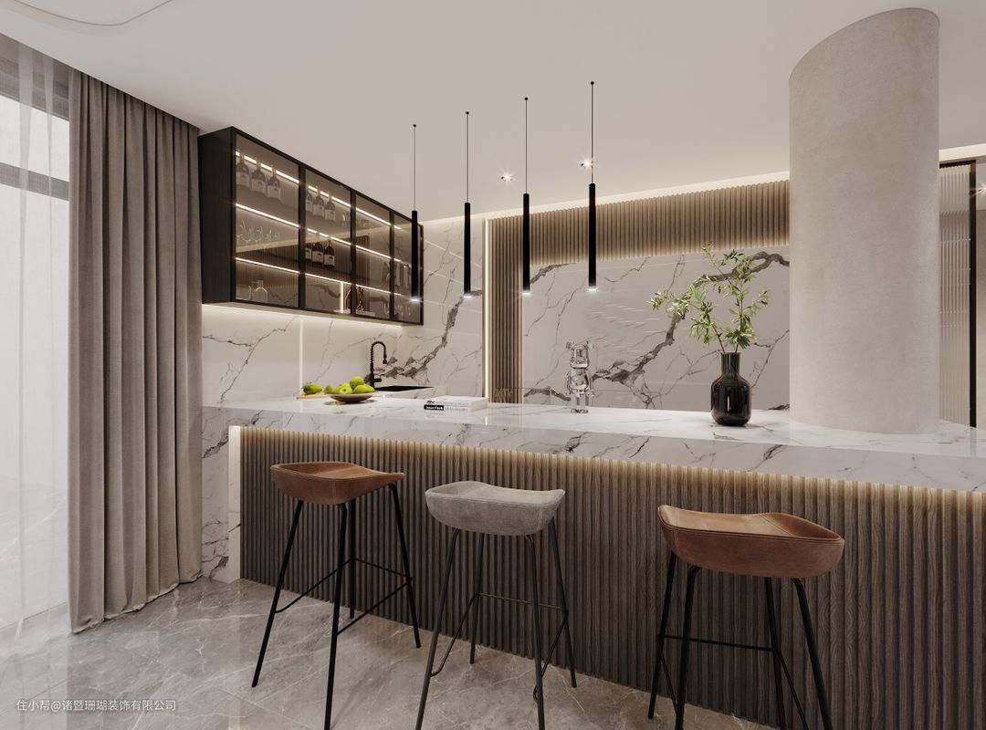 一侧吧台的设立,将空间动线更好地联结在一起,丰富功能场景,提高居住者生活幸福感。