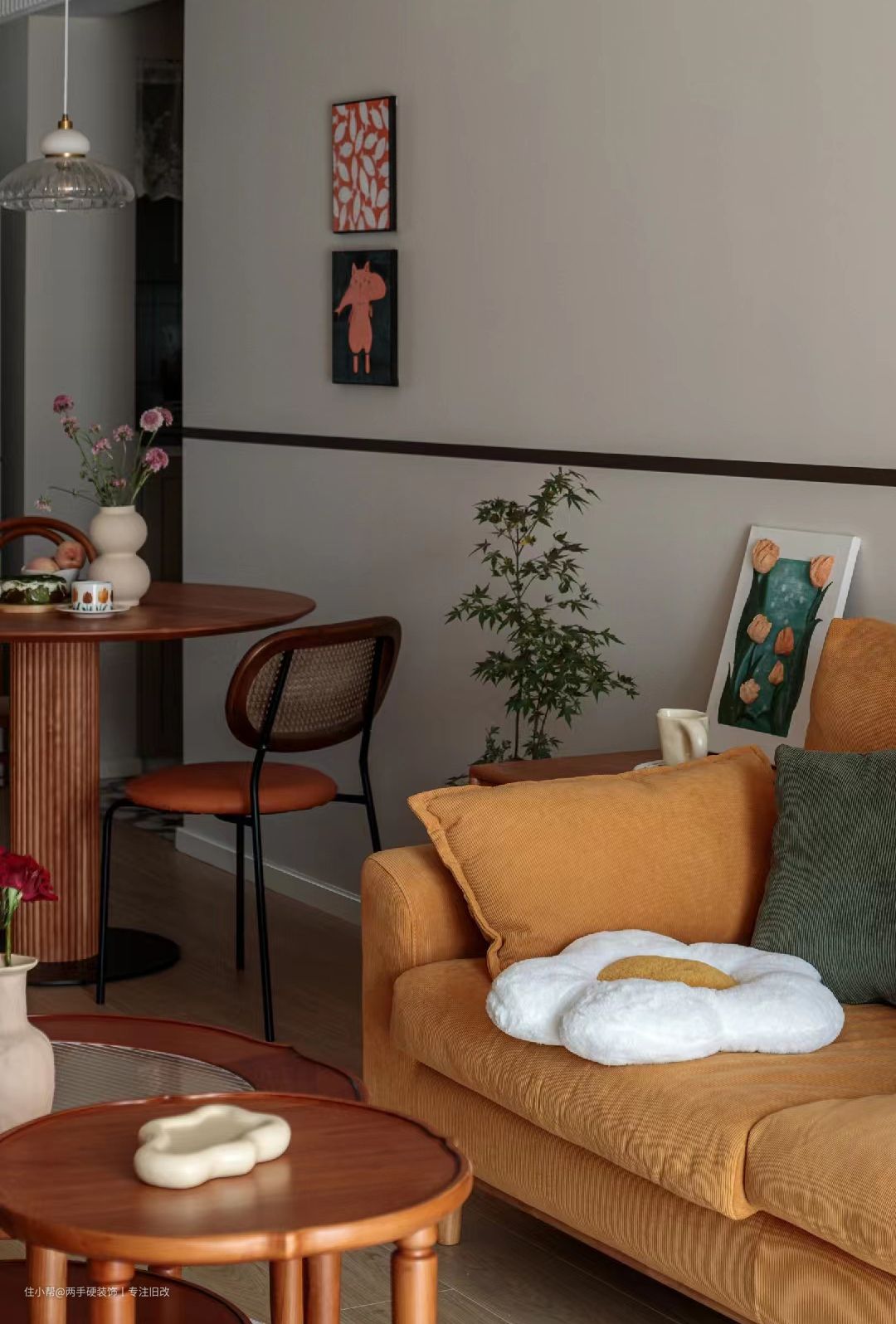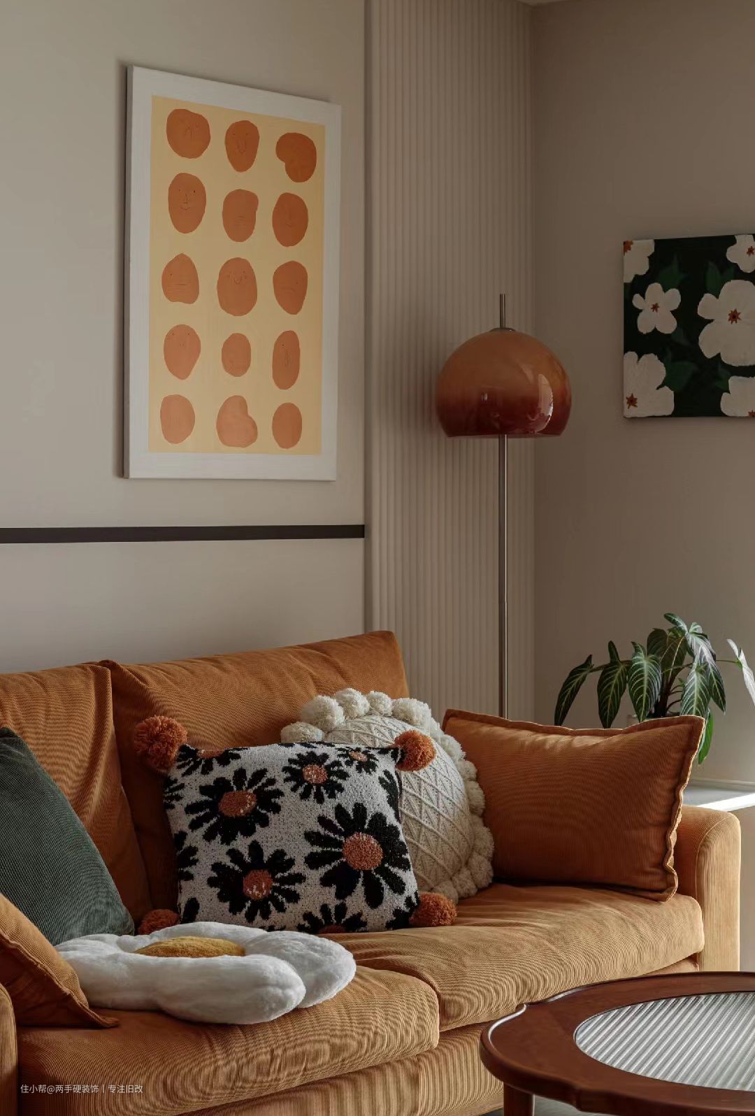 沙发上有多种不同款式的抱枕,还有可爱挂画、复古的包豪斯台灯、新鲜的绿植、造型不一的许多杯杯碟碟!各种不同类型的小玩意让客厅也变得更加有趣。