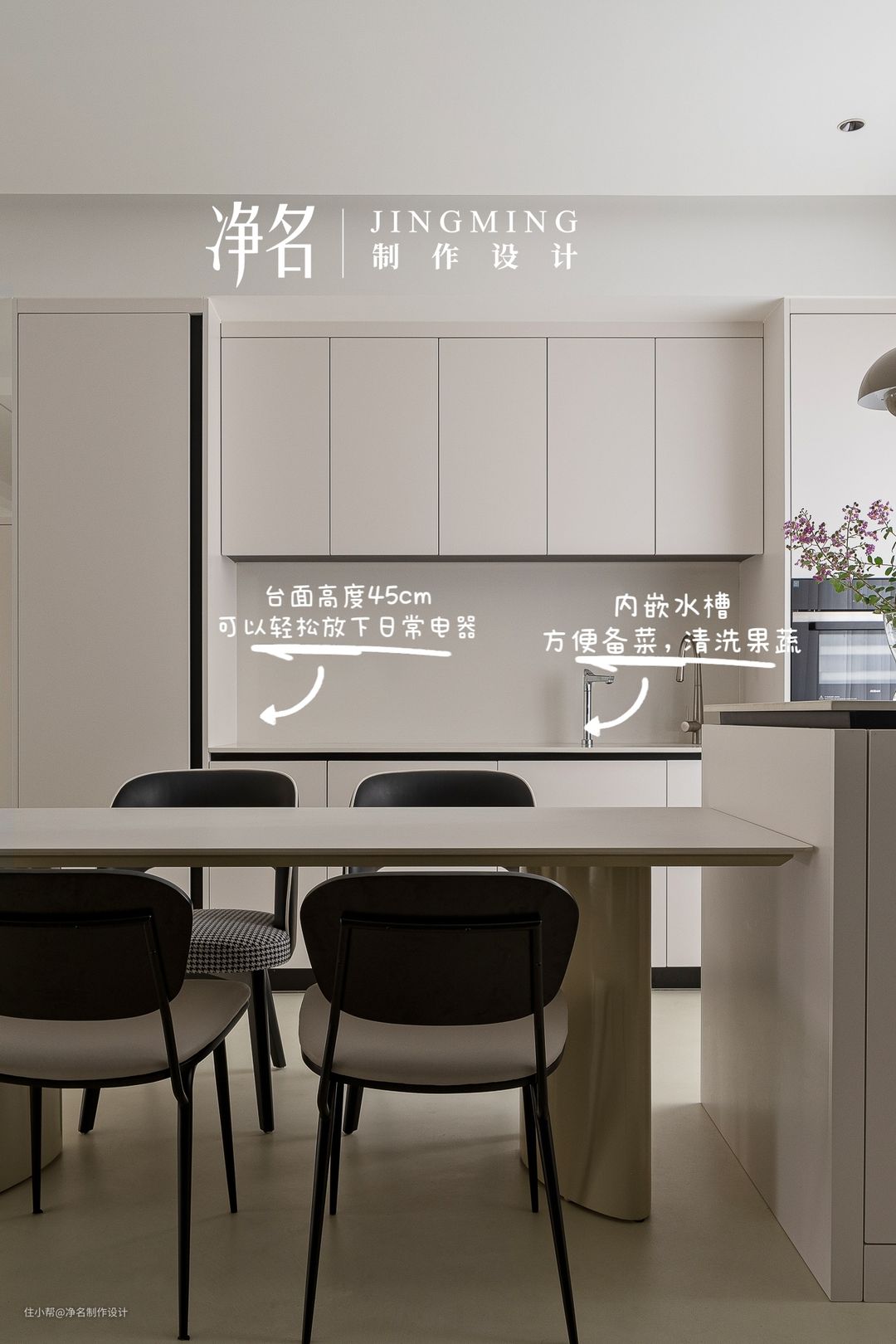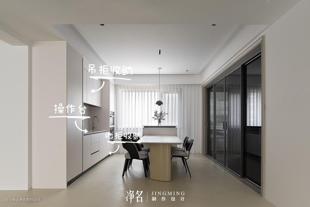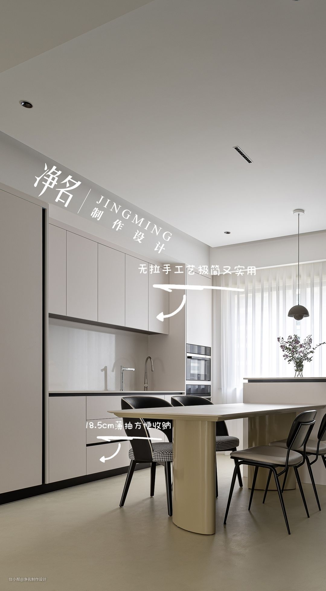 ·餐边柜白色门板颜色为进口板材w1000,哑光质感很高级✨柜子无把手设计。下柜收纳柜一侧斜面无拉手,这种无拉手的设计看起来更大气简约!