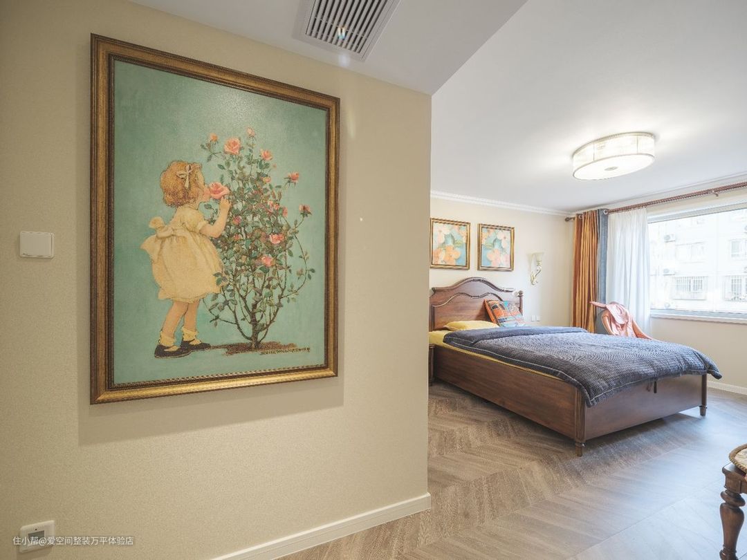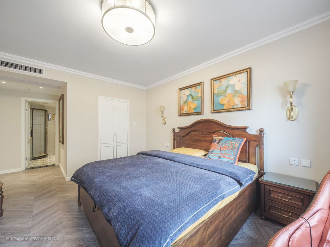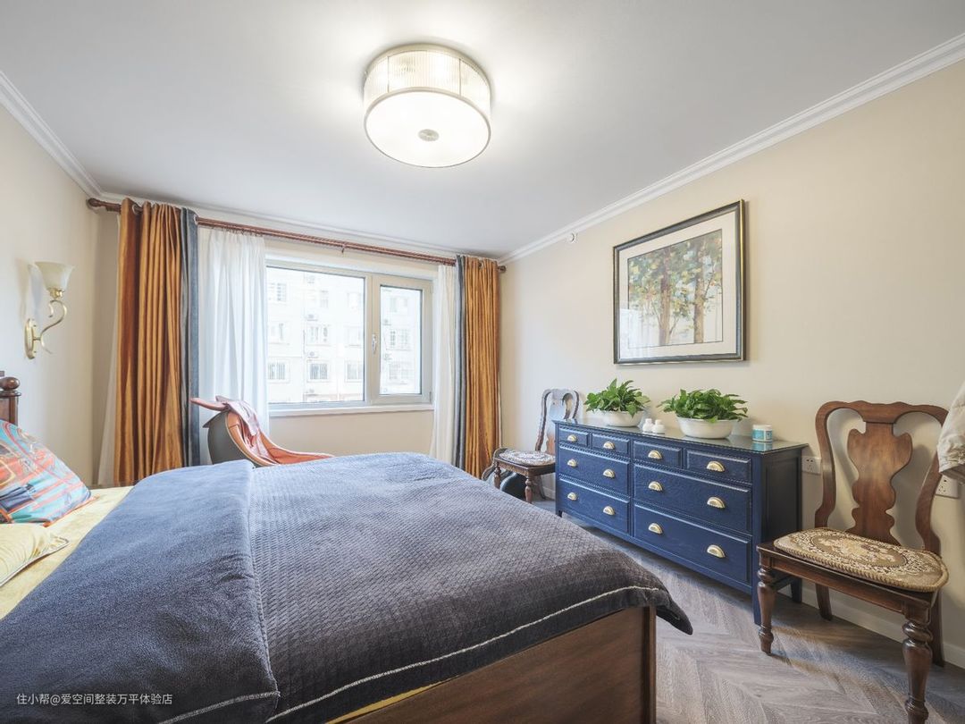 床尾斗柜简直就是增加收纳空间的利器,从小件物品到四件套、围巾,统统都可以收纳整齐。斗柜两旁是美式胡桃木色的椅子,日常在卧室就可以做在椅子上,不用到卧室就只能往床上做。