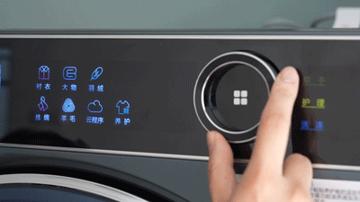 叠黛的两台机器通过右边的面板来选择切换要控制的机器:烘干、护理、洗涤以及洗烘联动使用。不同模式下对应着不同模式的操作系统。