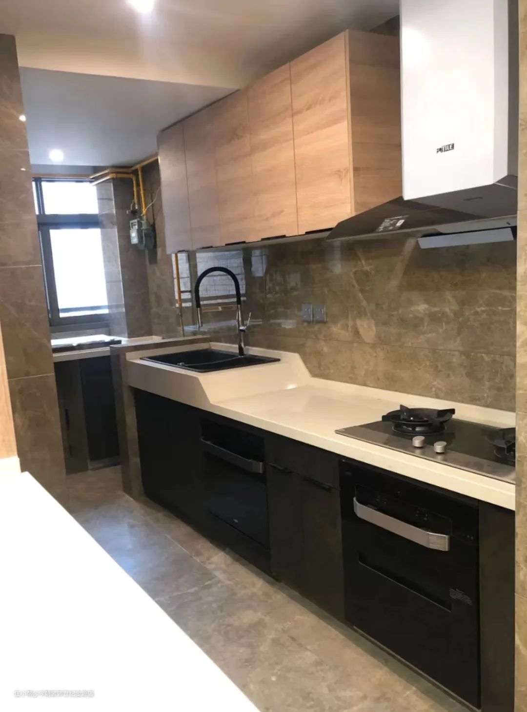 用「水槽区-备菜区-烹饪区」这种台面布局是比较合理的,中间的备菜区还可以放调料厨具。烹饪区低10cm,使用更顺手,高低差也让厨房有了层次感。