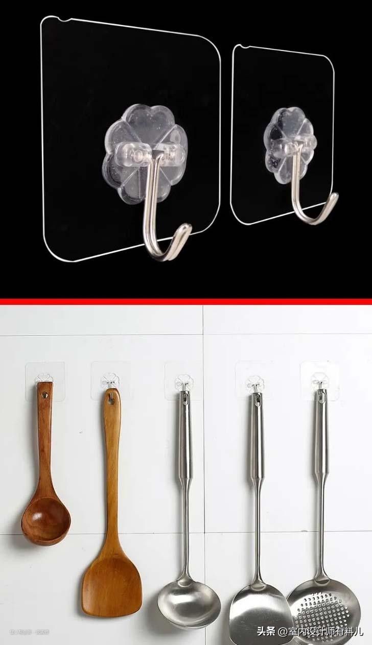 厨房东西一多,可以在墙面安排几个挂钩,那种透明无痕强粘胶的钩子,作用真的大,光滑的瓷砖墙面也可以随心安装,而且承重力杠杠的。