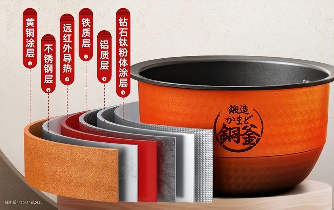 ▲厚度越厚,米饭能持续沸腾、煮出香甜软糯的米饭。这里内胆外层采用的是黄铜涂层,增加导热性。