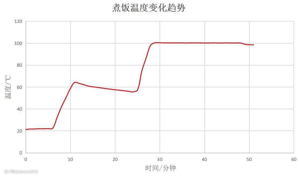 ▲煮饭持续时间52分钟,从温度数据分析,这款东芝IH电饭煲煮饭前10分钟为预热阶段,使米粒充分吸水。从11~25分钟60℃蓄热锁住饭香,期间米粒立体翻滚、这样可以让米饭松软。后正式进入煮饭环节,最高温度100.2℃。最高功率1250W、使加热时间缩短了一半。