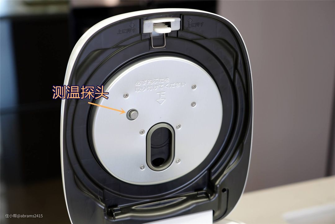 ▲顶盖拿走,背部有一颗测温探头,监测内部温度变化,动态调节输出。另外,它的锅盖有内嵌式微压阀,可有效防止溢锅。
