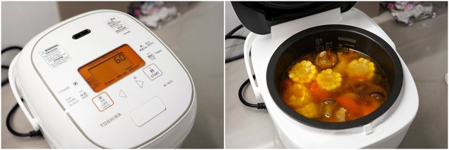 这款东芝IH电饭煲有煲汤功能,只需把食材预先处理完放入铜釜后选择炖汤模式即可。