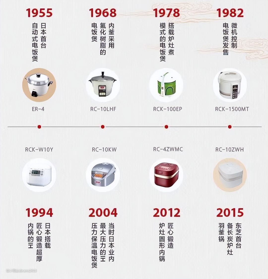 ▲东芝在1955最先发明了自动电饭煲,上图可以通过东芝电饭煲发展、看出整个电饭煲领域技术的革新。