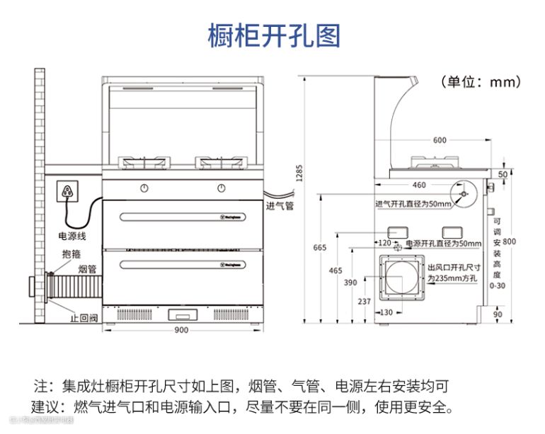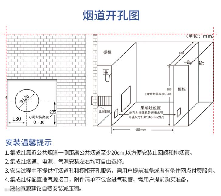 2.烟道口、燃气接口开孔位置,集成灶的安装孔位距离左右墙面要≥300mm,排烟管要<2m。