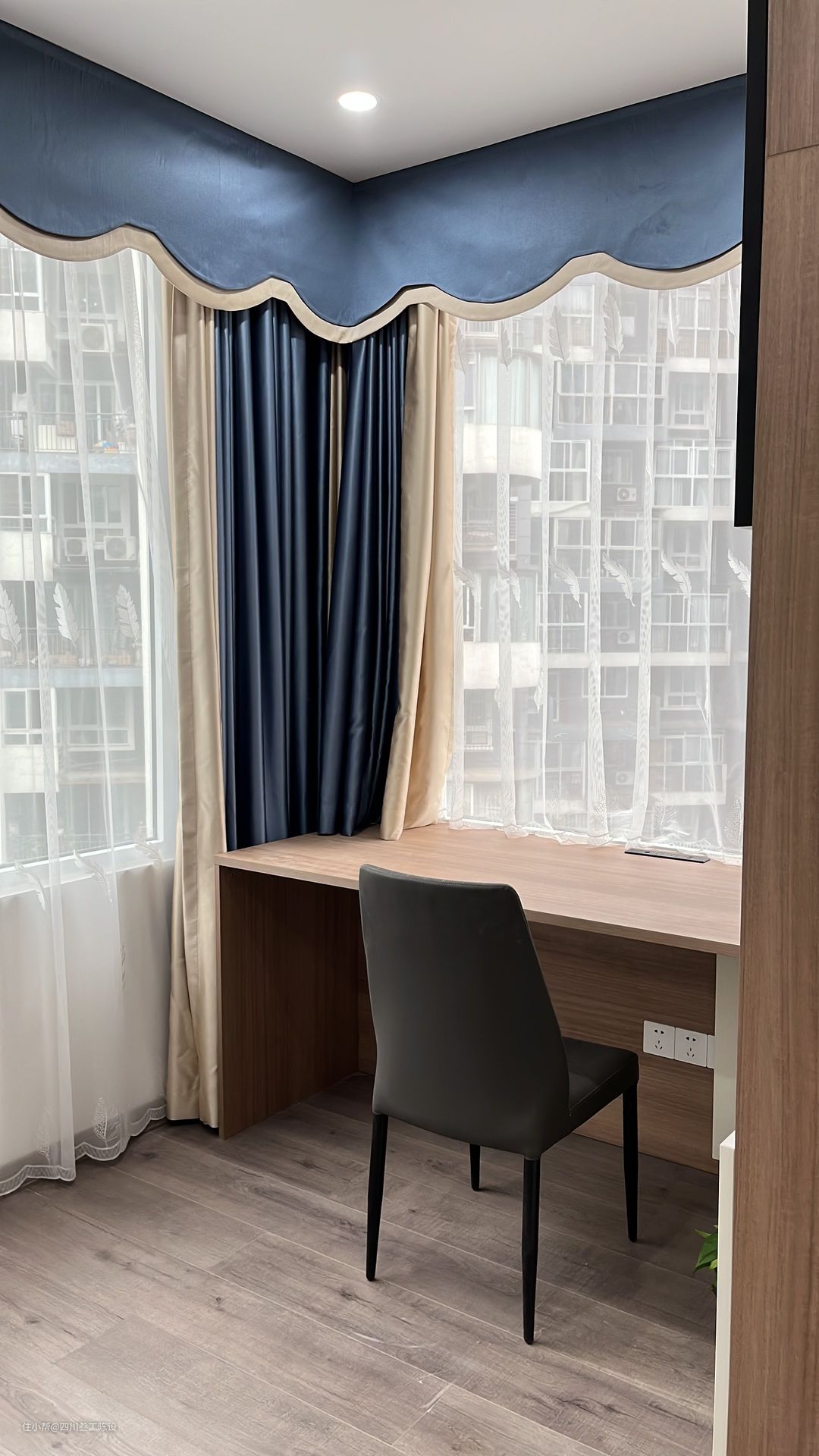 没忘记在桌子下安装几个插座哦,主要是方便给手机或电脑充电,就不需要在室内跑来跑去了。数座没有做抽屉,这样就算是喜欢跷二郎腿,也不会不舒服了。