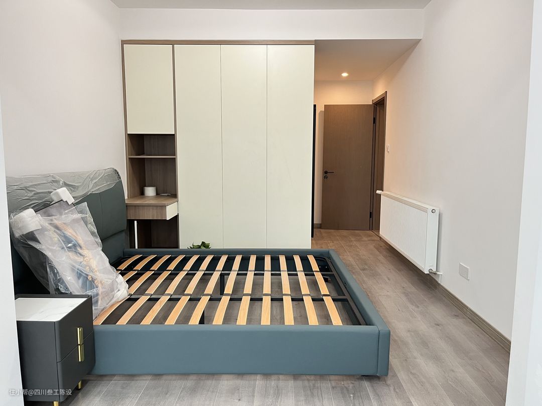 主卧受面积限制,做了衣柜床头柜一体化设计,提高了空间利用率的同时,还带有新颖感。另一侧则放置了常规的床头柜,但柜子很精致,岩板饰面+金属把手,自带一种低调奢侈之意。