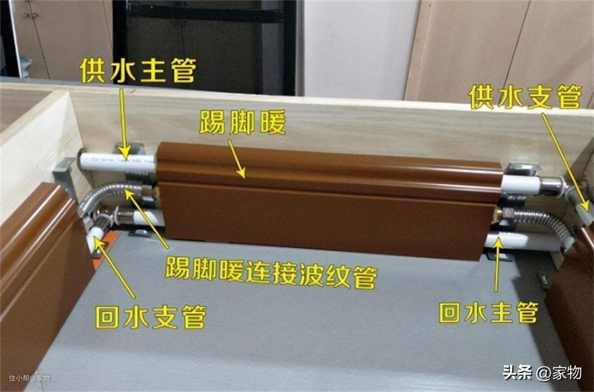 将暖气管道安装在踢脚线中,后期再用踢脚线遮起来就是踢脚暖。