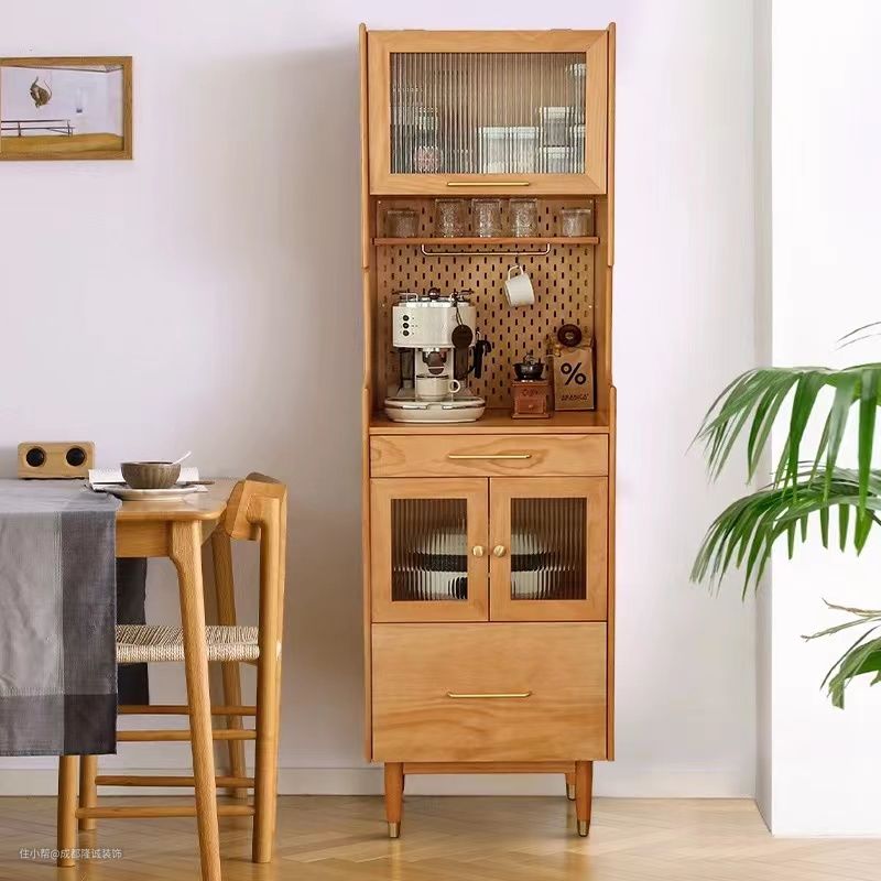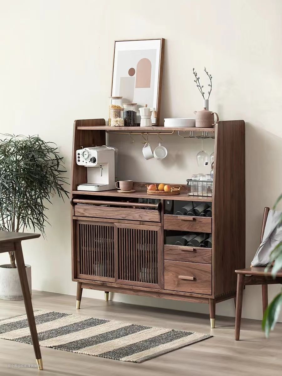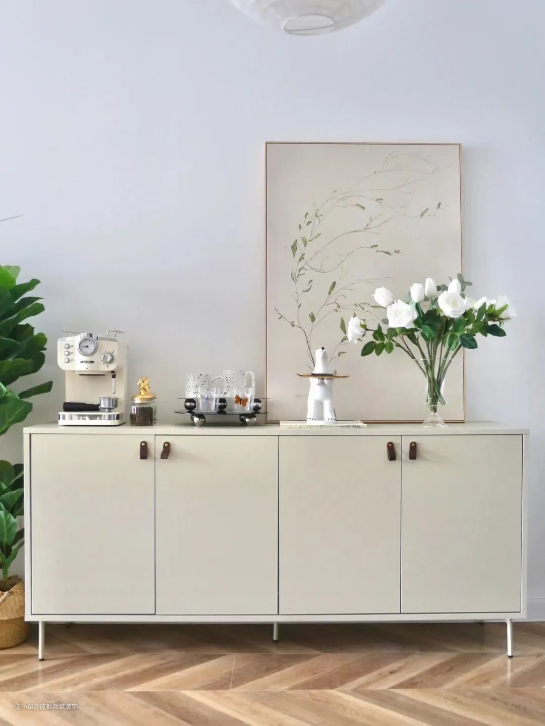 餐边柜、餐边柜,所以首先它是一个柜子,既然是柜子,那一定具备收纳存放能力,可以收放厨房一些不常用的小电器,以及各类餐具杯碟,甚至饮料、调酒机、咖啡机等等,减轻厨房台面、柜子以及餐桌的压力,也可以承接原本摆放在餐桌上的杂乱物件,让桌面更好的保证整洁美观性,干净整洁的台面和桌面总是让人在做饭和用餐时心情会更佳愉悦。