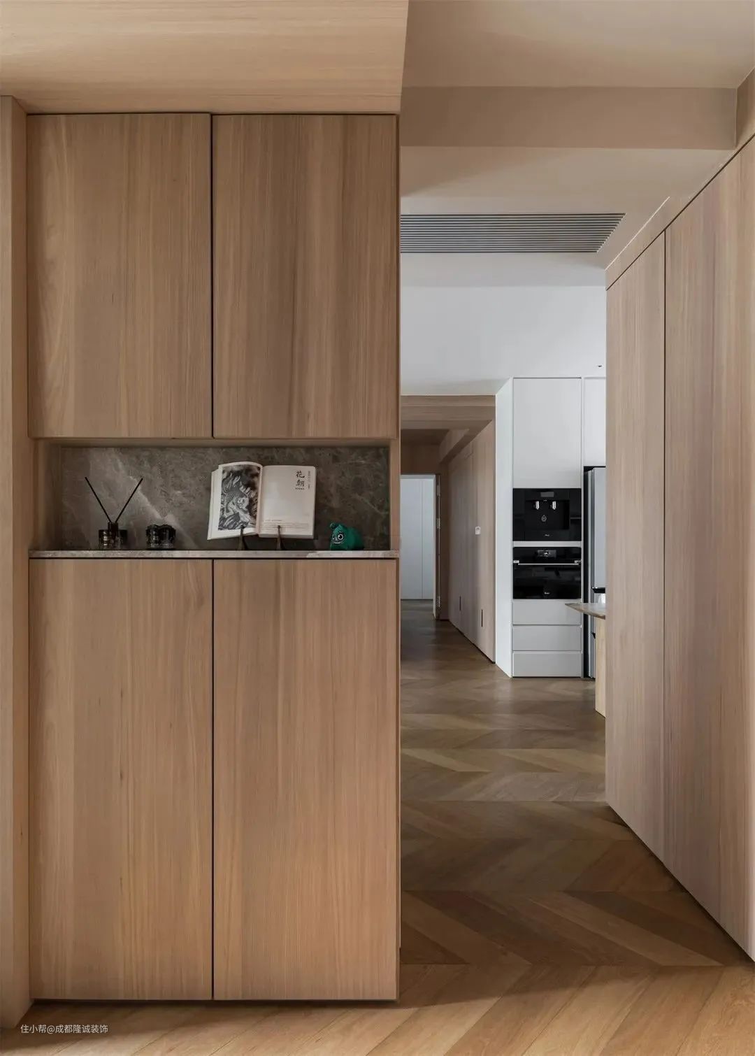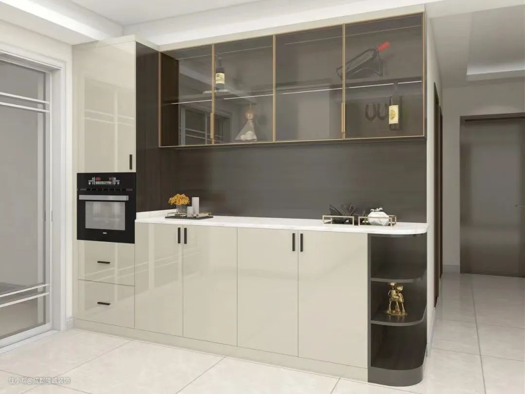 柜门:除了红酒或展示物品区域用玻璃柜门外,其他区域不建议大面积用玻璃柜门,不然存放的柜内物品多就容易显得杂乱;肤感柜门慎用,虽然视觉很好看,摸上去触感也很融合,但是特别容易留印,最好选择纯色的,更显高级。