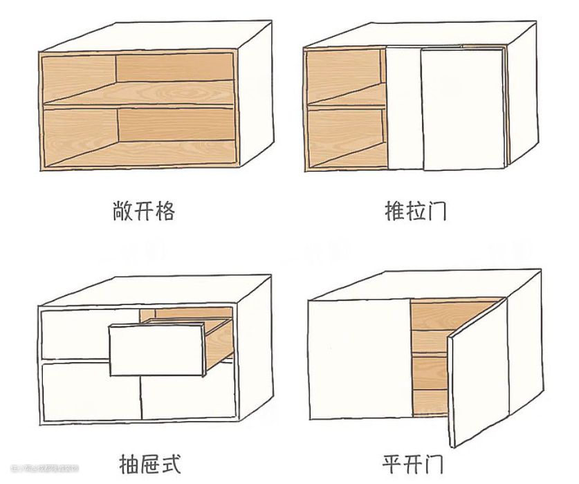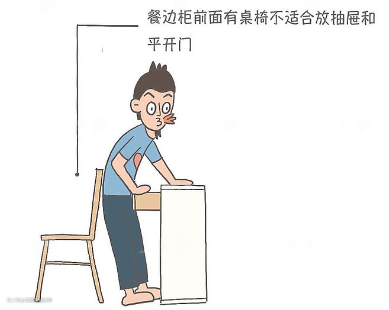 - 如果餐边柜前面有桌椅,且中间过道较窄,柜门最好选择推拉门,不适合平开门或抽屉;