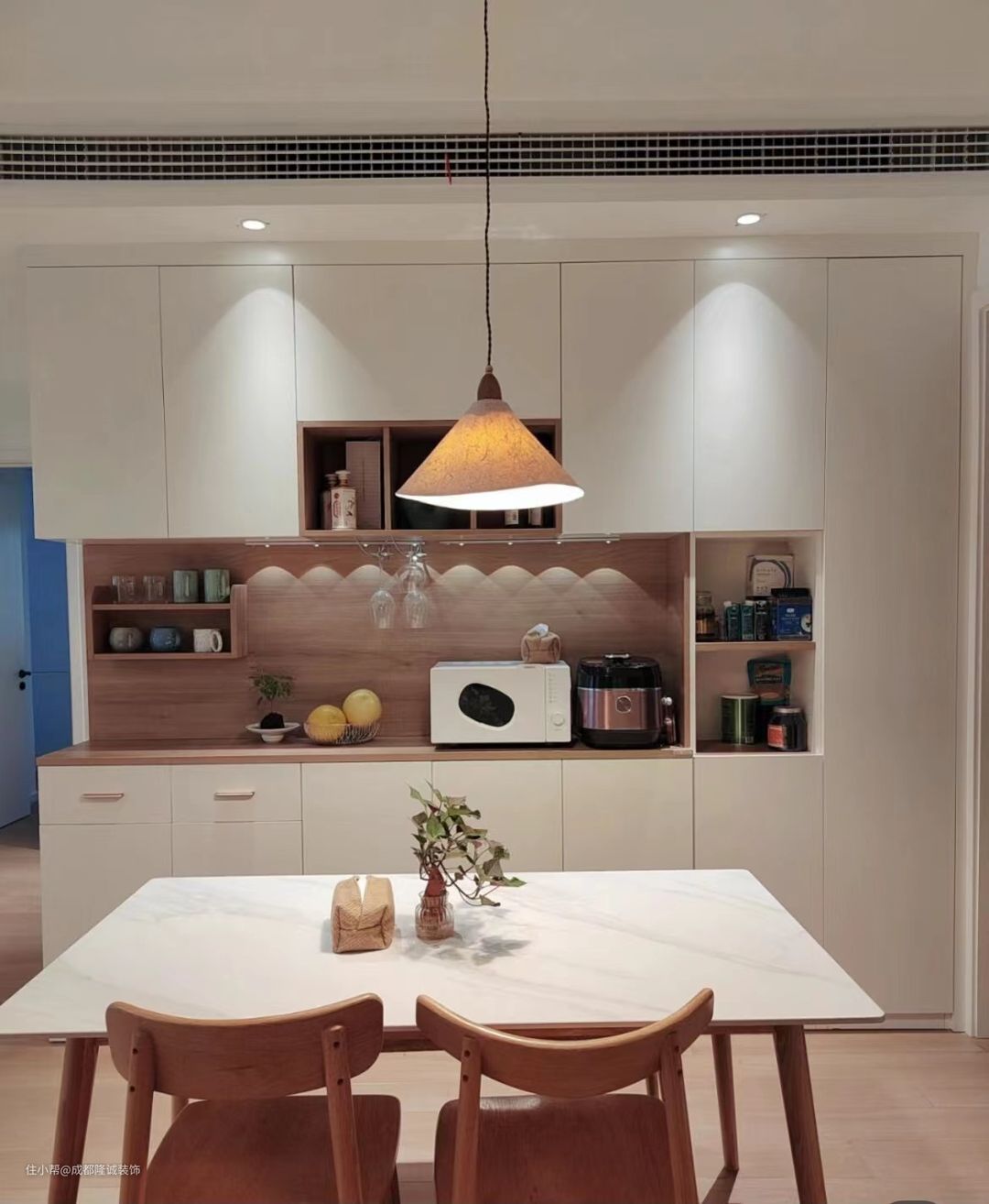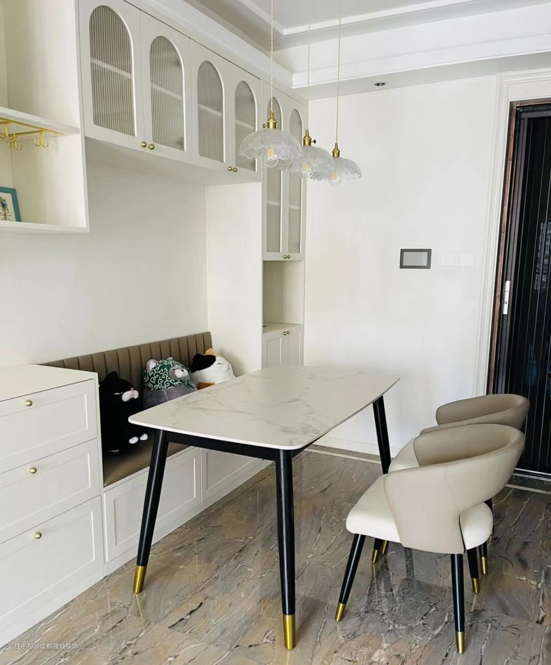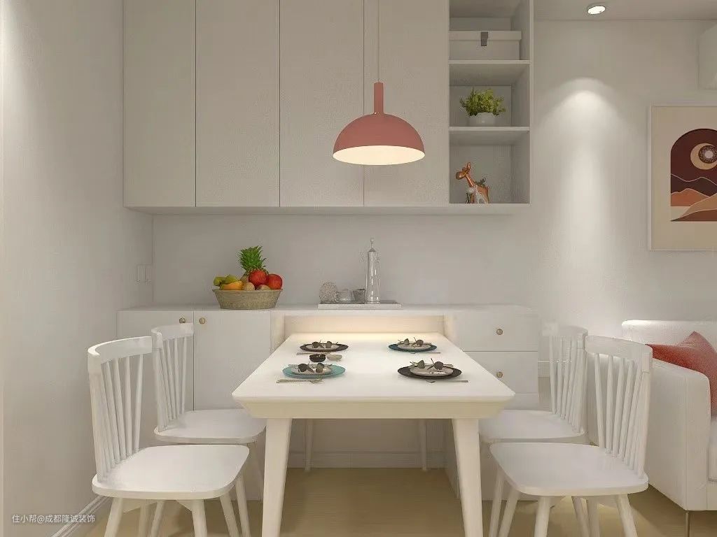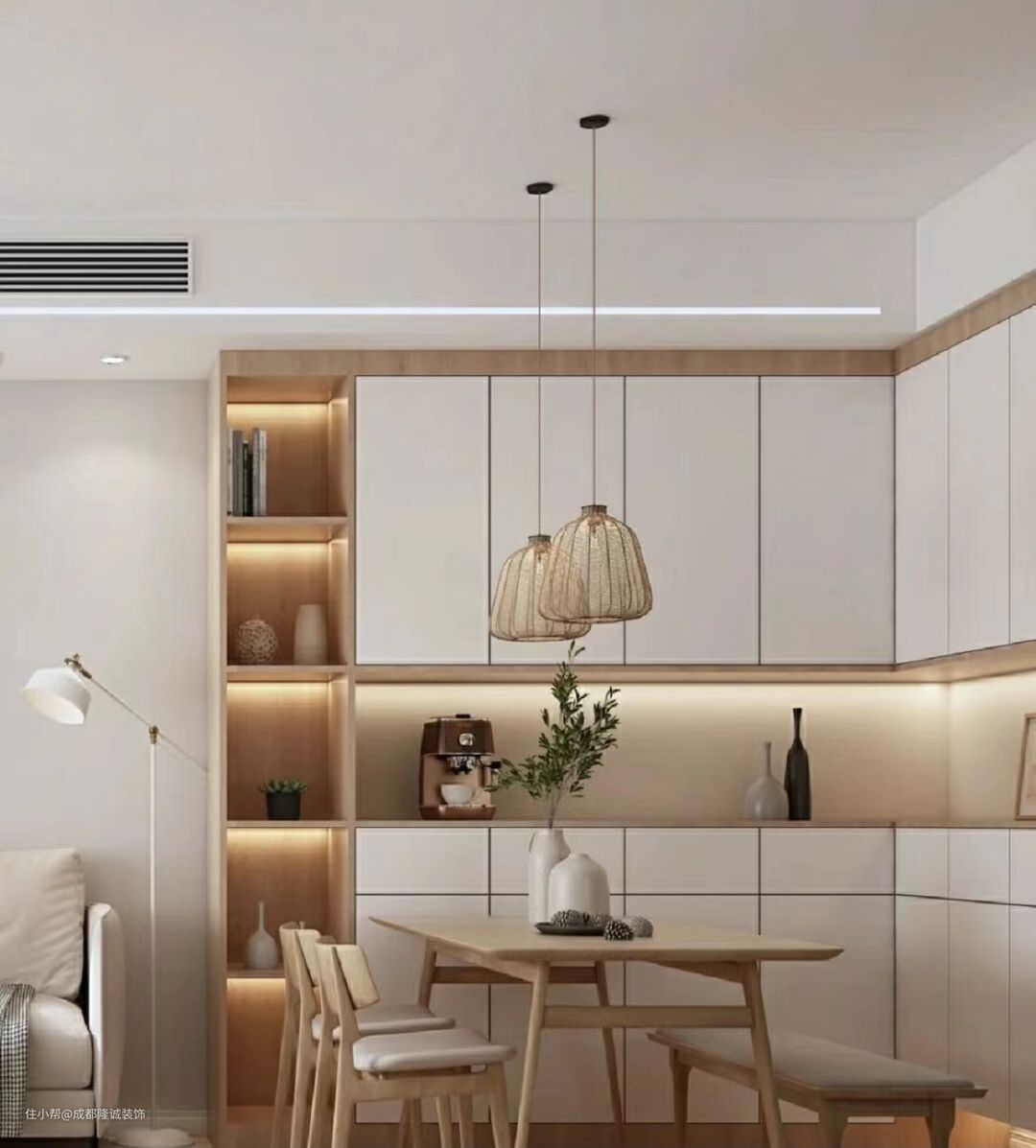 餐边柜和卡座结合的设计对于小户型很友好,节省空间占地面积的同时又能增加餐厅储物空间,同时还增加了空间设计感。