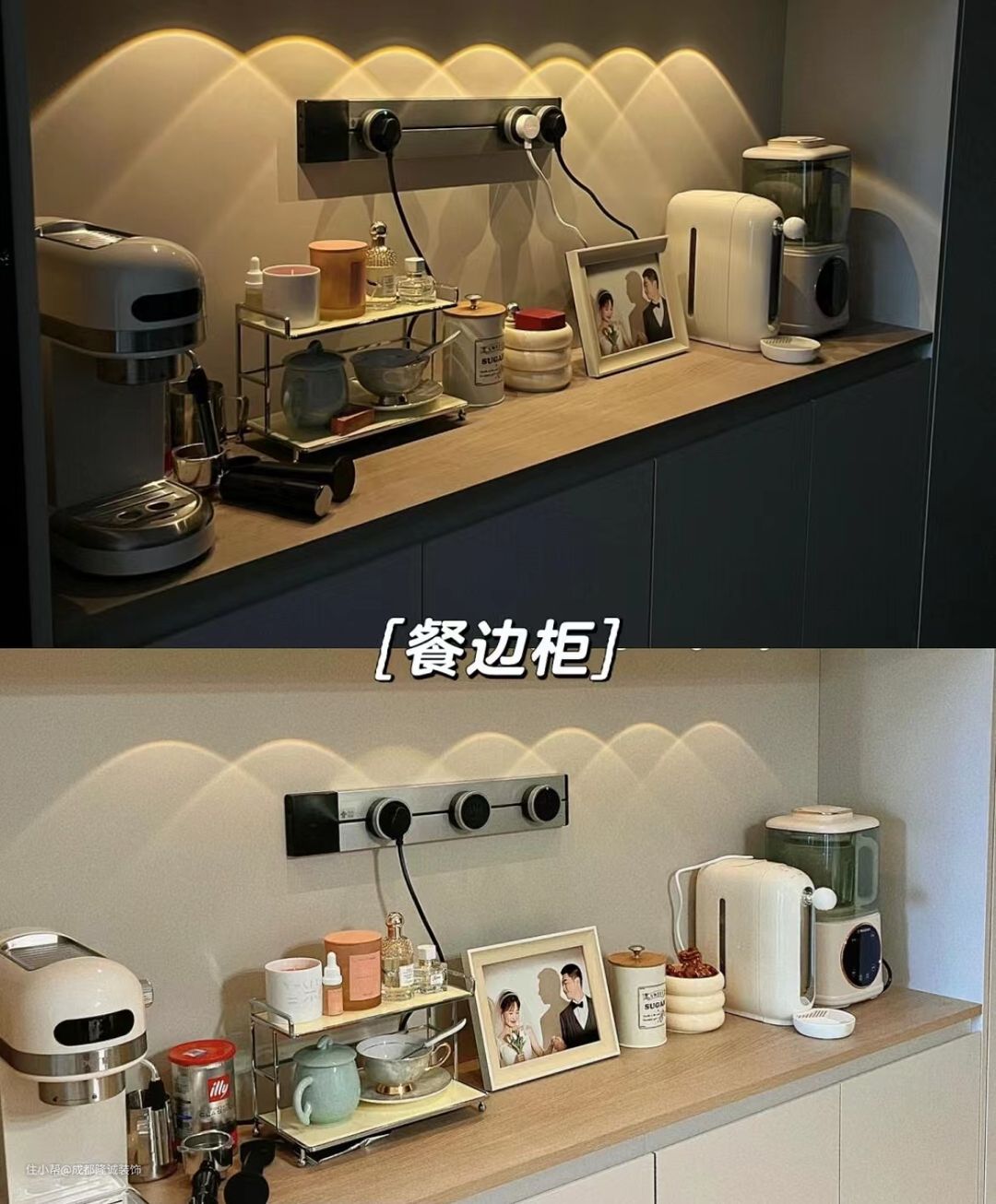 例如把厨房小电器外移之后,也增加了平常生活的使用便利,想要喝杯咖啡,或者热个牛奶都不用走进厨房中去了,在餐边柜台面就能简单解决,这就优化了我们的生活动线;或者是对餐边柜设计合理的收纳规划,让我们存放拿取东西更便捷,不怕东西太多堆积在一起,想用的时候到处翻找。