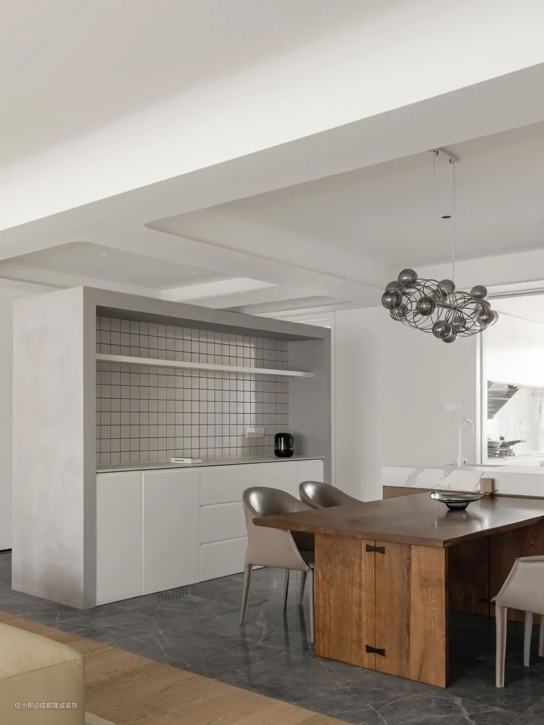 餐桌与柜体保持一定距离摆放,适合面积较大或者适中的空间,餐边柜可以选择整墙的顶天立地柜,中间预留出开放格操作空间,摆放物品。