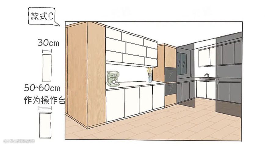 - 操作台一般是操作台高度根据厨房地柜公式选择:身高/2+0.05m=地柜高度,操作台高度要满足650mm;