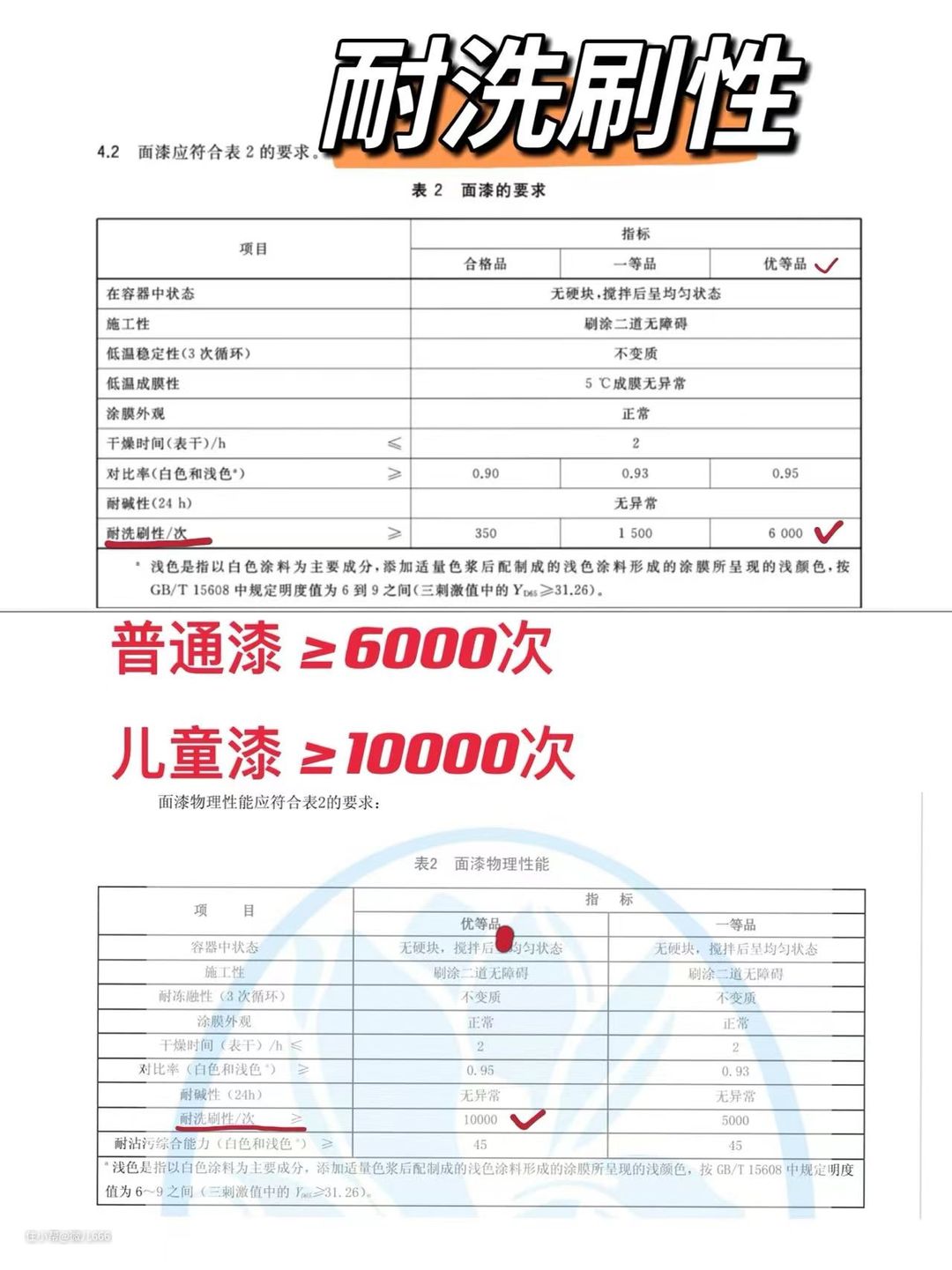 优等品: 耐擦洗性≥6000次 一等品 : 耐擦洗性≥1500次 合格品 : 耐擦洗性≥350次;