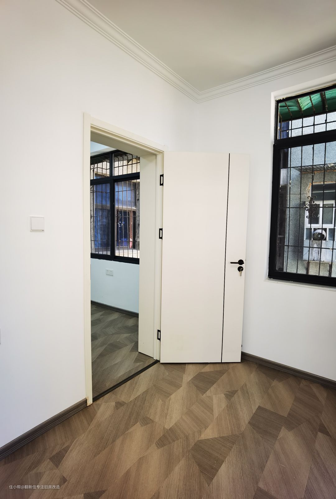 墙面搭配了纯白色乳胶漆,卧室门纯白加线条造型,不是轻奢胜似轻奢风。