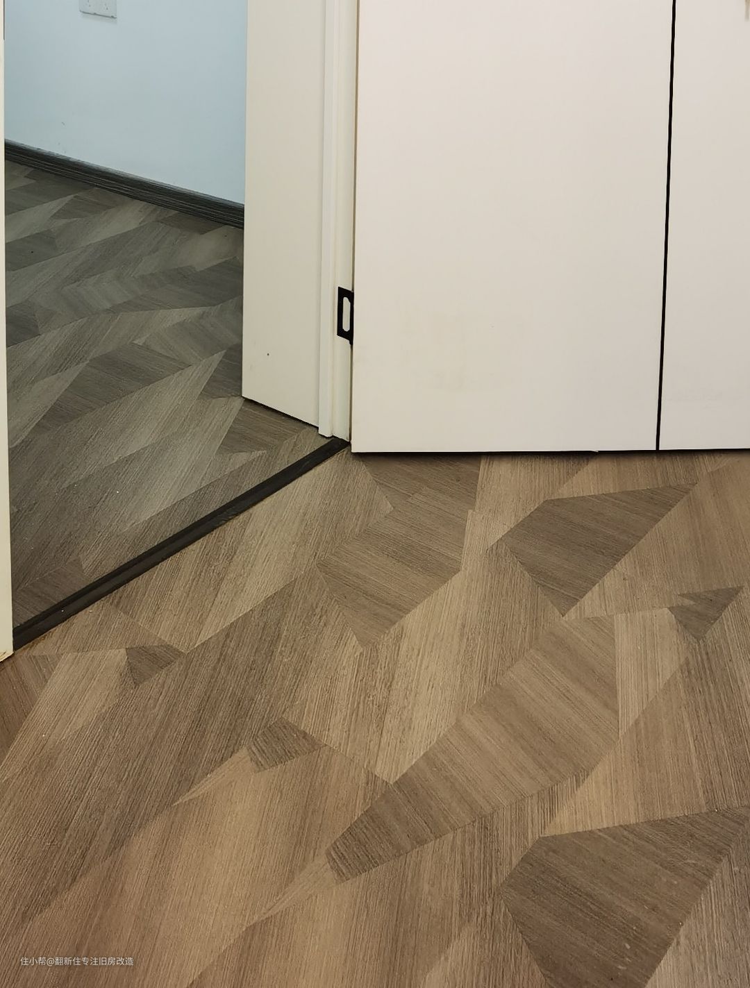 地板质感发挥的淋漓尽致,用黑色合金条替代门槛石,质感更加。