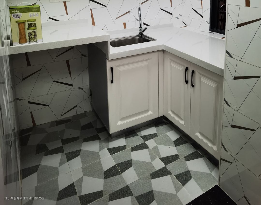 厨房面积不大,选择了L型橱柜,操作台高度为业主量身定制,做了错层设计,摘菜切菜不用弯腰。风格方面选择了网红花砖混贴,打破了传统风格。